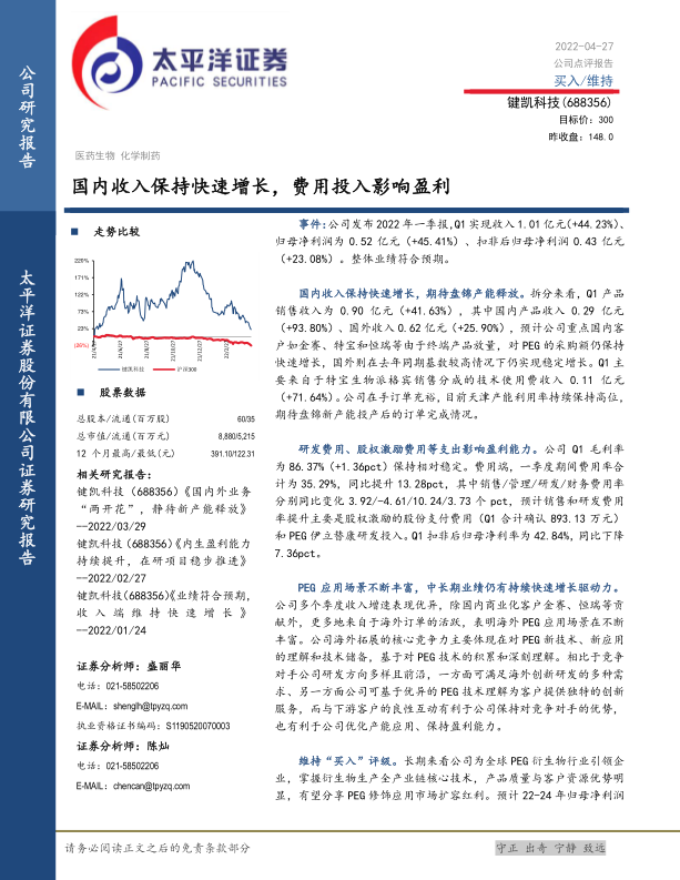 键凯科技在2022年第一季度实现了显著的收入增长,尤其在国内市场表现强劲,海外业务也保持稳定。尽管研发投入和股权激励费用导致短期盈利能力承压,但公司毛利率保持稳定,且在PEG技术创新和应用场景拓展方面展现出核心竞争力。随着盘锦新产能的逐步释放,公司有望更好地满足充裕的订单需求。报告维持“买入”评级,并预计公司未来几年净利润将持续快速增长,体现了其作为全球PEG衍生物行业引领者的长期增长潜力。