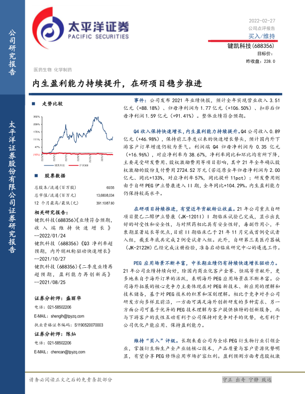 本报告分析了键凯科技2021年业绩快报,指出公司内生盈利能力持续提升,在研项目稳步推进,海外PEG应用场景不断丰富。公司凭借技术积累和创新服务,保持竞争优势。维持“买入”评级,但需关注产品订单量、客户合作、新品研发和竞争压力等风险。报告还提供了详细的财务数据和预测,为投资者提供参考。
