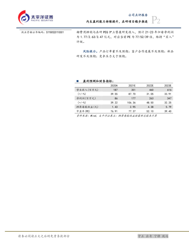 维持“买入”评级。长期来看公司为全球PEG衍生物行业引领企业,掌握衍生物生产全产业链核心技术,产品质量与客户资源优势明显,有望分享PEG修饰应用市场扩容红利。盈利预测方面考虑股权激励费用摊销与在研PEG伊立替康研发投入,预计21-23年归母净利润为1.77/2.63/3.47亿元,对应当前PE为77/52/39倍,维持“买入”评级。