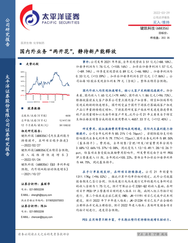 21 年公司业绩持续向好,除国内商业化客户金赛、恒瑞等贡献外,更多地来自于海外订单的活跃,表明海外 PEG 应用场景在不断丰富。公司海外拓展的核心竞争力主要体现在对 PEG 新技术、新应用的理解和技术储备,基于对 PEG 技术的积累和深刻理解。相比于竞争对手公司研发方向多样且前沿,一方面可满足海外创新研发的多种需求、另一方面公司可基于优异的 PEG 技术理解为客户提供独特的创新服务,而与下游客户的良性互动有利于公司保持对竞争对手的优势,也有利于公司优化产能应用、保持盈利能力。