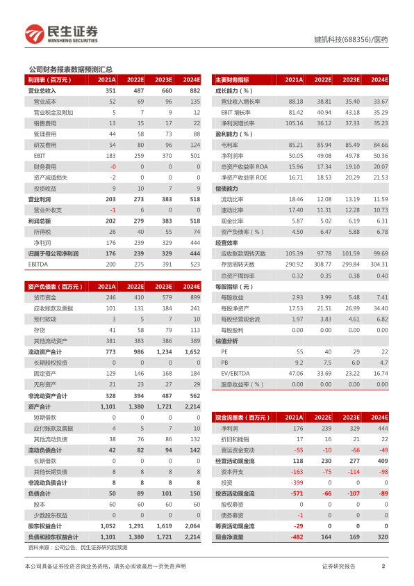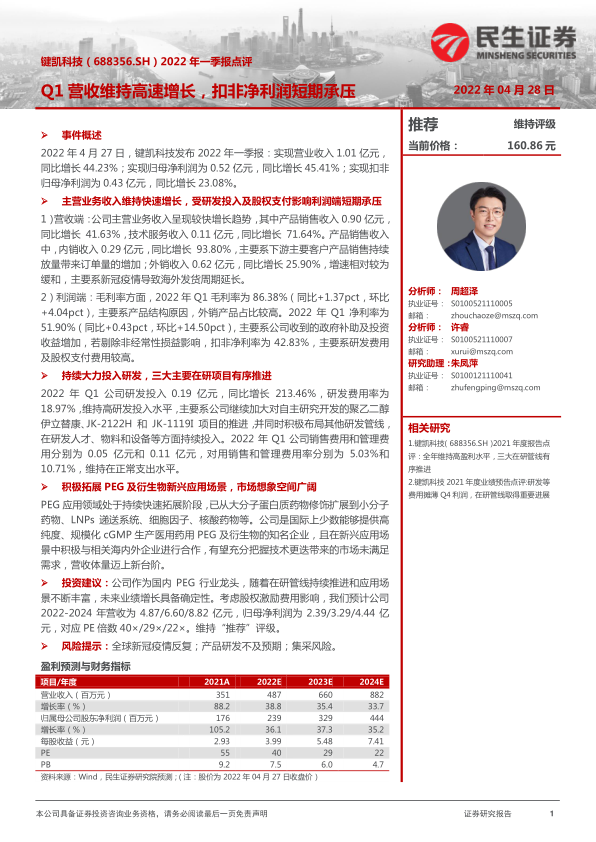 本报告对键凯科技2022年一季报进行了全面分析。公司营收维持高速增长,但受研发投入和股权支付影响,扣非净利润短期承压。公司持续大力投入研发,积极拓展PEG及衍生物新兴应用场景,市场想象空间广阔,未来业绩增长具备确定性。维持“推荐”评级,但需关注全球新冠疫情反复、产品研发不及预期以及集采风险。