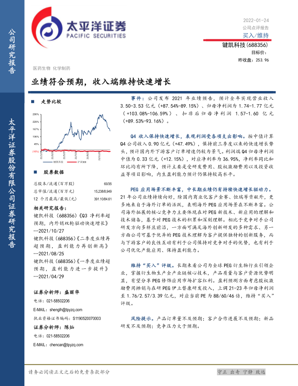 键凯科技在2021年展现出强劲的业绩增长势头,营业收入和归母净利润均实现翻倍增长,符合市场预期。尽管第四季度利润受到研发费用和股权激励等因素影响,但公司收入端仍保持快速增长,且内生盈利能力预计维持高水平。公司业绩增长的核心驱动力在于其在PEG衍生物领域的技术领先优势、不断丰富的应用场景以及成功的海外市场拓展。分析师基于对公司未来持续增长的信心,维持了“买入”评级,并上调了未来三年的盈利预测,预计公司营收和净利润将继续保持稳健增长。