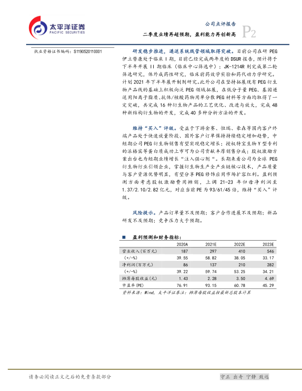 维持“买入”评级。受益于下游金赛、恒瑞、豪森等国内客户终端产品处于快速放量阶段、国外客户订单保持持续稳定增加趋势,中短期公司 PEG 衍生物销售有望实现稳定增长;授权特宝生物 Y 型专利的派格宾等蛋白质成功上市可为公司贡献丰厚销售分成;股权激励方案出台也为短期业绩增长“注入强心剂“。长期来看公司为全球 PEG衍生物行业引领企业,掌握衍生物生产全产业链核心技术,产品质量与客户资源优势明显,有望分享 PEG 修饰应用市场扩容红利。盈利预测方面 考虑股权激励费用摊销, 上调 21-23 年 归母净利润 至1.37/2.10/2.82 亿元,对应当前 PE 为 93/61/45 倍,维持“买入”评级。