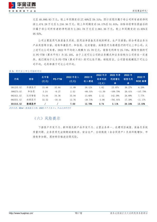 同行业上市公司对比:综合考虑业务与产品类型等方面,选取华康医疗、和佳退、达实智能、尚荣医疗为港通医疗的可比上市公司;从上述可比公司来看,2022年平均收入规模为15.78亿元,销售毛利率为25.74%;剔除负值的可比PE-TTM(算术平均)为35.10X,由于上述可比公司的业务模式和业务结构与公司存在一定差异,我们倾向于认为PE-TTM(算术平均)的可比性不高;相较而言,公司营收规模低于可比公司平均,毛利率高于可比公司平均。