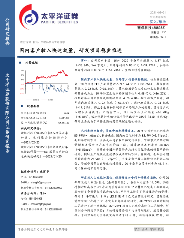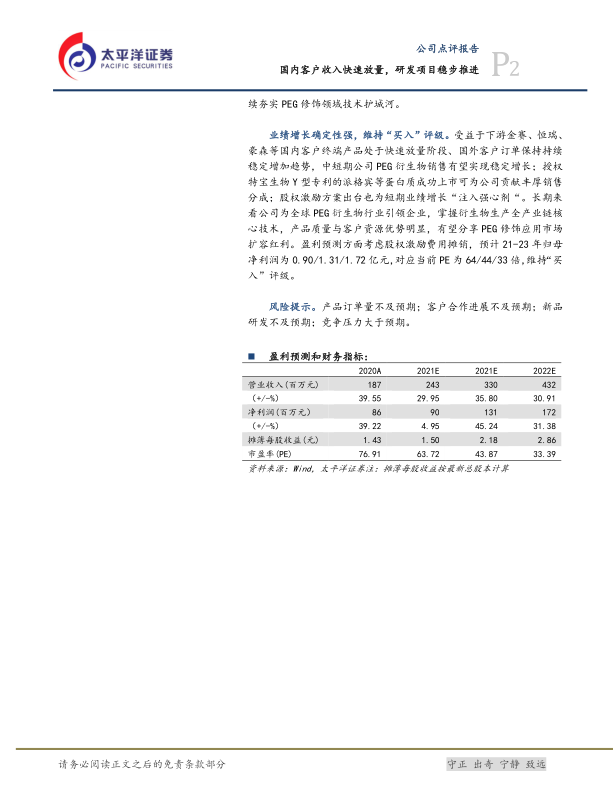 业绩增长确定性强,维持“买入”评级。受益于下游金赛、恒瑞、豪森等国内客户终端产品处于快速放量阶段、国外客户订单保持持续稳定增加趋势,中短期公司PEG衍生物销售有望实现稳定增长;授权特宝生物Y型专利的派格宾等蛋白质成功上市可为公司贡献丰厚销售分成;股权激励方案出台也为短期业绩增长“注入强心剂“。长期来看公司为全球PEG衍生物行业引领企业,掌握衍生物生产全产业链核心技术,产品质量与客户资源优势明显,有望分享PEG修饰应用市场扩容红利。盈利预测方面考虑股权激励费用摊销,预计21-23年归母净利润为0.90/1.31/1.72亿元,对应当前PE为64/44/33倍,维持“买入”评级。