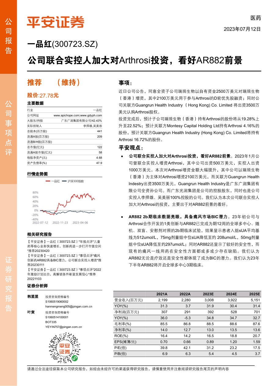 本报告分析了一品红公司联合实控人加大对Arthrosi投资的事件,认为此举是基于对AR882药物前景的看好。AR882在临床数据上表现亮眼,具有成为BIC药物的潜力。同时,报告分析了中国痛风市场的发展前景,并维持对一品红公司的“推荐”评级,但也提示了研发风险、核心产品降价风险和新品种放量不及预期风险。