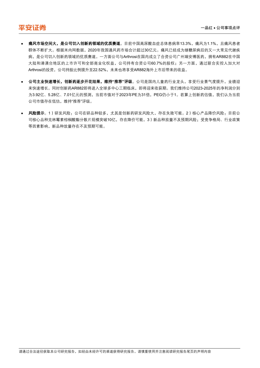 公司主业快速增长,创新药逐步开花结果,维持“推荐”评级。公司是国内儿童药行业龙头,享受行业景气度提升,业绩迎来快速增长。同时创新药AR882即将进入全球多中心三期临床,即将迎来收获期。我们维持公司2023-2025年的净利润分别为3.92亿、5.28亿、7.01亿元的预测,当前市值对于2023年PE为31倍,PEG仍小于1。若算上创新药估值,我们认为当前公司市值存在低估,维持“推荐”评级。