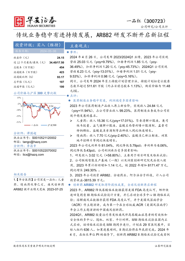 本报告对一品红(300723)进行了深入分析,认为公司传统医药制造业务稳健发展,儿童药板块表现突出。创新药AR882的研发进展顺利,有望成为公司未来业绩增长的重要驱动力。同时,公司推出的员工持股计划也彰显了对未来发展的信心。维持“买入”评级,并对公司未来三年的收入和利润进行了预测。