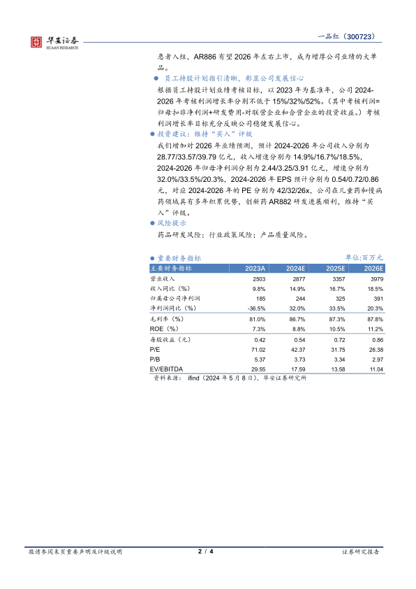 我们增加对2026年业绩预测,预计2024-2026年公司收入分别为28.77/33.57/39.79亿元,收入增速分别为14.9%/16.7%/18.5%,2024-2026年归母净利润分别为2.44/3.25/3.91亿元,增速分别为32.0%/33.5%/20.3%,2024-2026年EPS预计分别为0.54/0.72/0.86元,对应2024-2026年的PE分别为42/32/26x,公司在儿童药和慢病药领域具有多年积累优势,创新药AR882研发进展顺利,维持“买入”评级。