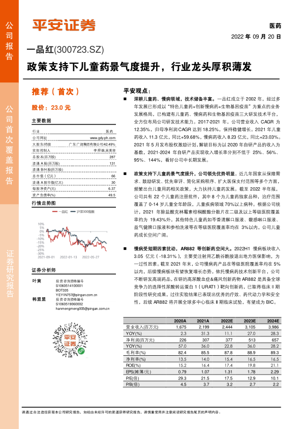 首次覆盖,给予“推荐”评级。一品红是一家以医药研发、生产、销售为核心业务的现代化医药企业,为儿童药行业龙头企业。我们选取同行业内各细分子行业龙头,如华东医药、苑东生物、兴齐眼药作为可比公司,2022 年可比公司平均估值为 24X。一品红2022年对应PE仅18倍,性价比突出,首次覆盖,给予“推荐”评级。