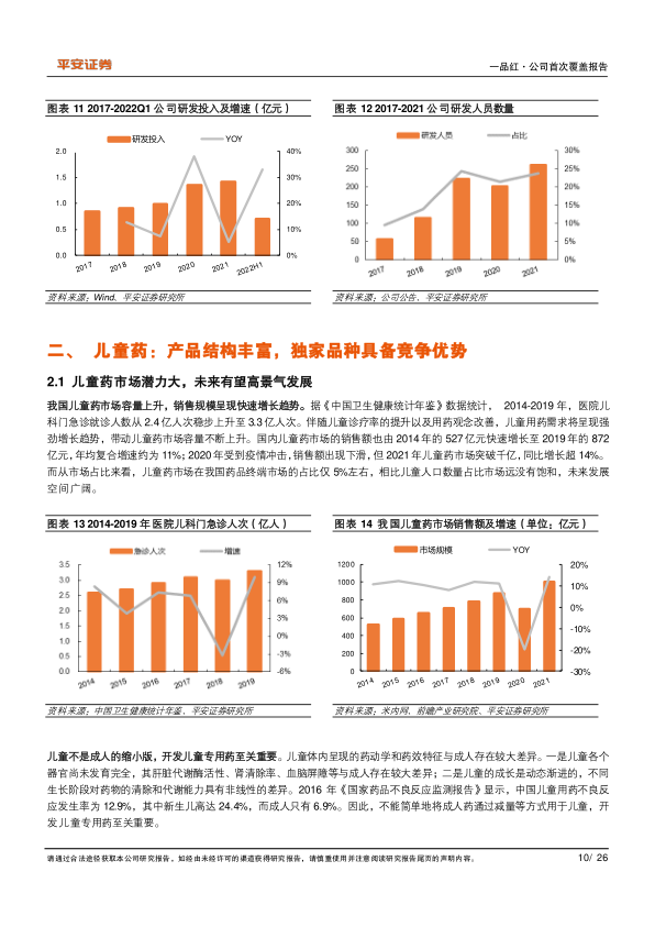 政策支持下儿童药景气度提升,公司领先优势明显。近几年国家从保障需求、鼓励研发、优先审评、简化采购程序、扩大医保支付范围等多个方面,频繁出台儿童用药相关政策,大力扶持儿童药发展。截至2022半年报,公司共有22个儿童药注册批件,其中8个为儿童药独家品种,治疗范围覆盖了0-14岁儿童全年龄段,儿童疾病领域70%以上病种。根据公司统计,2021年除盐酸克林霉素棕榈酸酯分散片在二级及以上等级医院覆盖率约为19.43%外,其他特色儿童药如芩香清解口服液、馥感啉口服液、益气健脾口服液和参柏洗液等在等级医院覆盖率均在3%以内,公司儿童药成长空间广阔。
