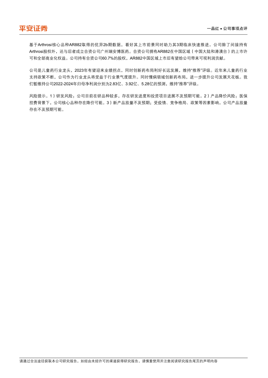 公司是儿童药行业龙头,2023年有望迎来业绩拐点,同时创新药布局利好长远发展,维持“推荐”评级。近年来儿童药行业支持政策不断,公司作为行业龙头将受益于行业景气度提升。同时慢病领域创新药布局,进一步提升公司发展天花板。我们暂维持公司2022-2024年归母净利润分别为2.83亿、3.92亿、5.28亿的预测,维持“推荐”评级。