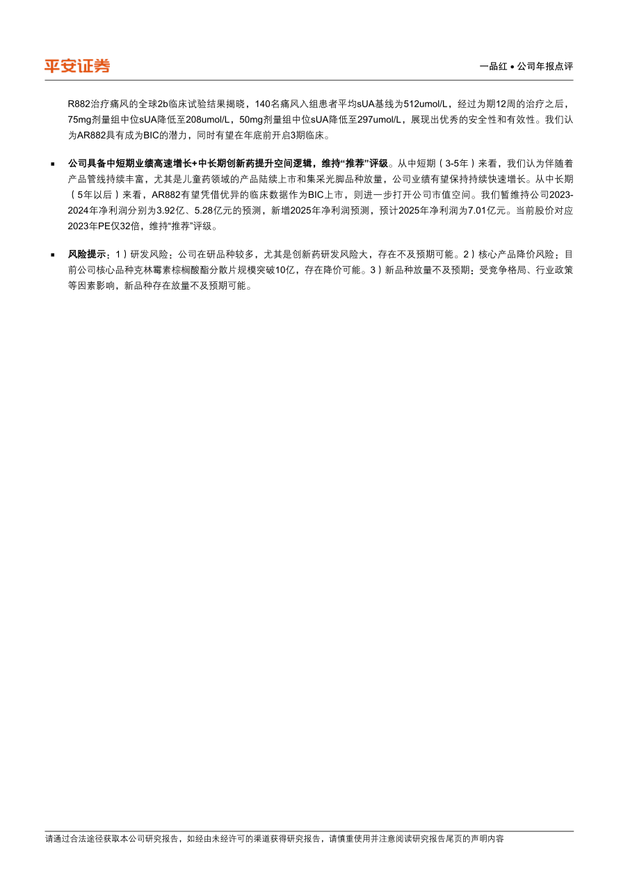 公司具备中短期业绩高速增长+中长期创新药提升空间逻辑,维持“推荐”评级。从中短期(3-5年)来看,我们认为伴随着产品管线持续丰富,尤其是儿童药领域的产品陆续上市和集采光脚品种放量,公司业绩有望保持持续快速增长。从中长期(5年以后)来看,AR882有望凭借优异的临床数据作为BIC上市,则进一步打开公司市值空间。我们暂维持公司2023-2024年净利润分别为3.92亿、5.28亿元的预测,新增2025年净利润预测,预计2025年净利润为7.01亿元。当前股价对应2023年PE仅32倍,维持“推荐”评级。