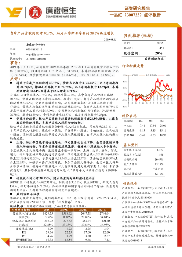 本报告对一品红(300723)2019年半年报进行了深入分析,指出公司自有产品营收的显著增长是推动业绩增长的主要动力。同时,公司在区域市场拓展、研发投入和平台建设方面也取得了积极进展。维持“强烈推荐”评级,并预测公司未来几年的EPS将持续增长。