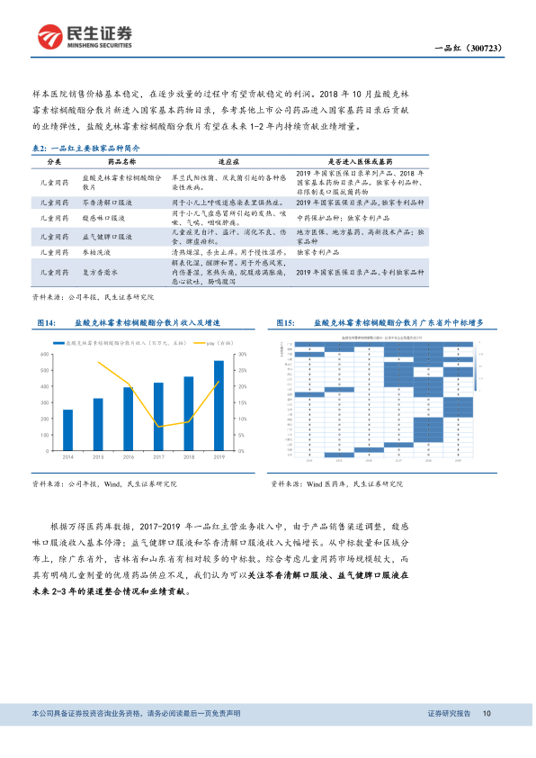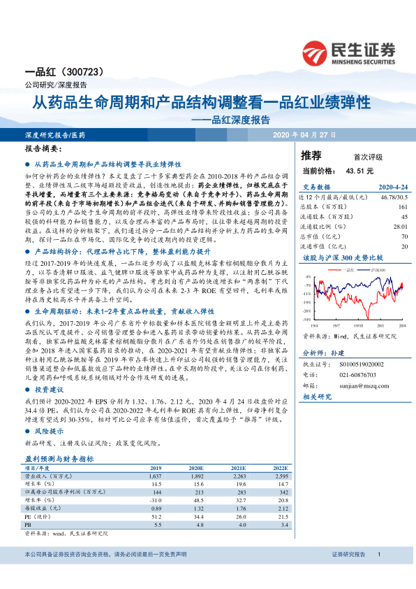 本报告深入剖析了一品红(300723)的业绩弹性来源,核心观点在于其增长动力主要源于主力产品处于药品生命周期的前半段以及持续优化的产品结构。通过对2010-2018年二十多家典型药企的产品组合调整、业绩弹性及二级市场超额投资收益的复盘研究,报告创造性地提出,药企业绩弹性归根结底在于寻找增量,而增量主要有三个关键来源:竞争格局变动(来自竞争对手)、药品生命周期的前半段(来自市场初期增长)和产品组合迭代(来自研发、并购和销售管理能力)。当公司的主力产品处于生命周期的前半段时,往往能带来高弹性的阶段性业绩收益;而当公司具备较强的科研能力和销售能力,并拥有合理而丰富的产品布局时,则能实现超越周期的投资收益。一品红目前正处于主力产品快速放量、产品结构逐步优化的阶段,其独家品种如盐酸克林霉素棕榈酸酯分散片、益气健脾口服液等仍处于生命周期的前半段,叠加2018年进入国家基药目录的推动,预计在2020-2021年有望持续贡献业绩增量。
