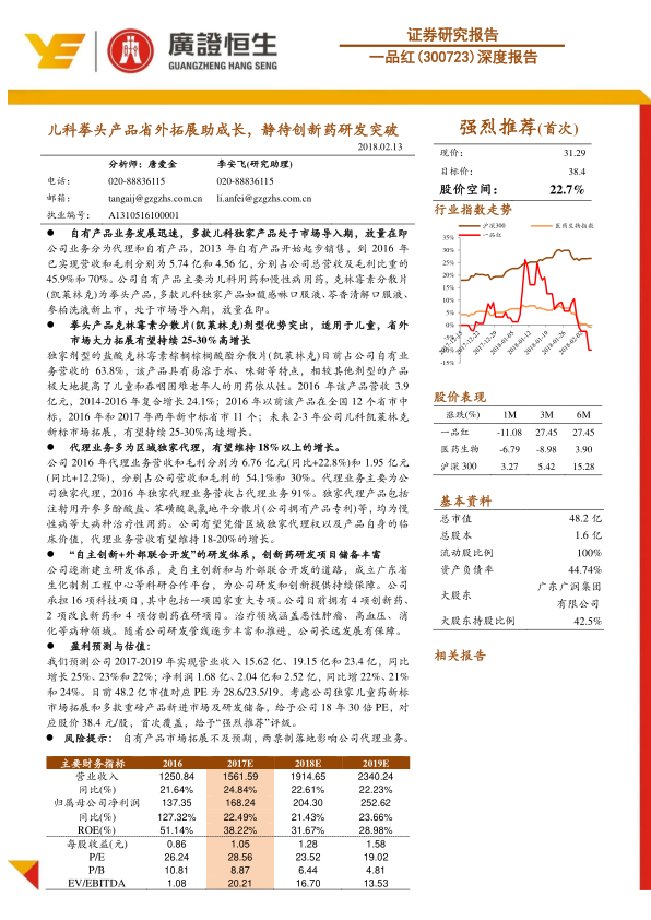 报告预测公司2017-2019年营业收入将分别达到15.62亿、19.15亿和23.4亿,同比增长25%、23%和22%;净利润将分别达到1.68亿、2.04亿和2.52亿,同比增长22%、21%和24%。基于公司独家儿童药的市场拓展、多款重磅产品新进市场以及丰富的研发储备,报告给予公司2018年30倍PE,对应目标价38.4元/股,首次覆盖并给予“强烈推荐”评级。