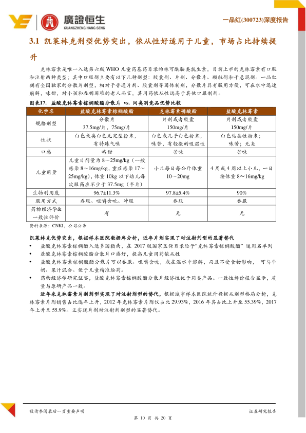 拳头产品盐酸克林霉素棕榈酸酯分散片(凯莱林克)是公司儿科用药的核心品种,2016年占儿科用药营收的79%。该产品作为全国独家分散片剂型,具有易溶于水、味甜、服用方便等特点,显著提高了儿童和吞咽困难老年人的用药依从性,优于其他口服剂型。根据样本医院数据,克林霉素片剂剂型对注射剂型实现了显著替代,其销售占比从2012年的29.93%上升至2017年上半年的55.9%。一品红的凯莱林克市场占比也逐年提升,从2012年的28%增至2017年上半年的56%,2014-2016年销售额复合增长率达24%。