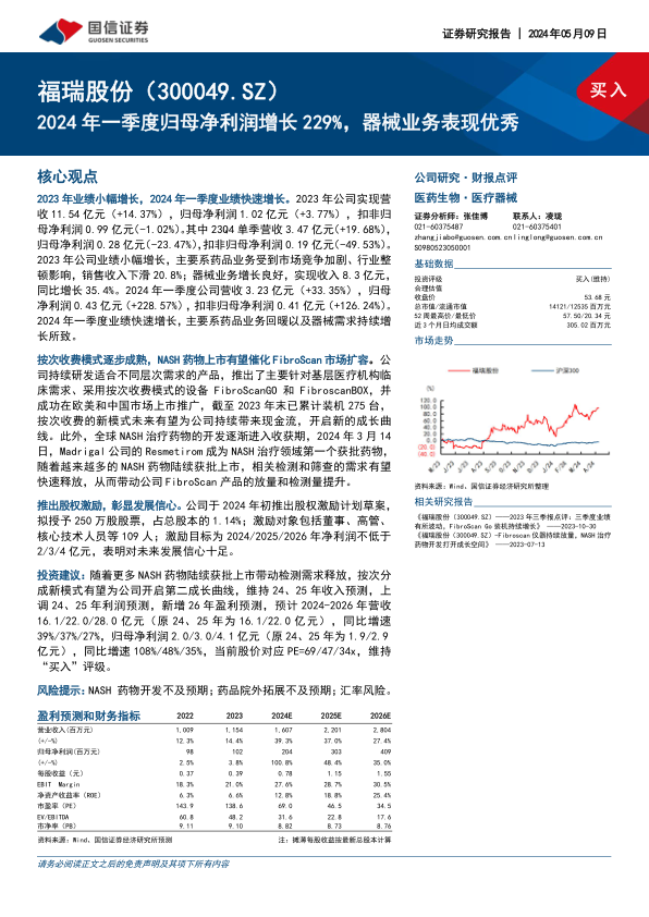 本报告分析表明,福瑞股份2024年一季度业绩大幅增长,主要受益于药品业务回暖和器械业务的强劲增长。公司积极拓展市场,按次收费模式逐步成熟,NASH药物的上市有望进一步催化FibroScan市场扩容。公司推出的股权激励计划彰显了对未来发展的信心。维持对公司“买入”评级,并上调了未来盈利预测,看好公司未来的发展前景。