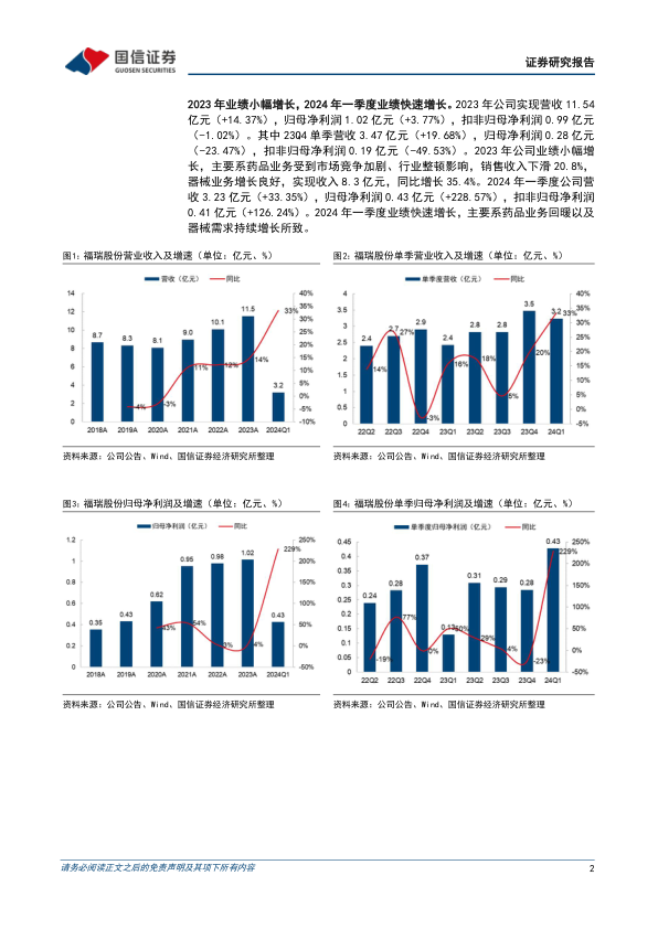 2023年业绩小幅增长,2024年一季度业绩快速增长。2023年公司实现营收11.54亿元(+14.37%),归母净利润1.02亿元(+3.77%),扣非归母净利润0.99亿元(-1.02%)。其中23Q4单季营收3.47亿元(+19.68%),归母净利润0.28亿元(-23.47%),扣非归母净利润0.19亿元(-49.53%)。2023年公司业绩小幅增长,主要系药品业务受到市场竞争加剧、行业整顿影响,销售收入下滑20.8%;器械业务增长良好,实现收入8.3亿元,同比增长35.4%。2024年一季度公司营收3.23亿元(+33.35%),归母净利润0.43亿元(+228.57%),扣非归母净利润0.41亿元(+126.24%)。2024年一季度业绩快速增长,主要系药品业务回暖以及器械需求持续增长所致。