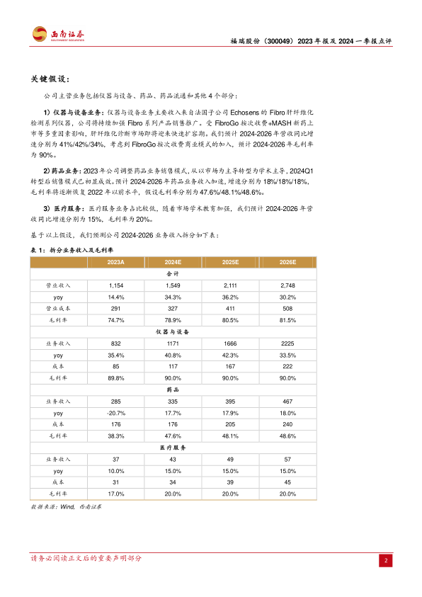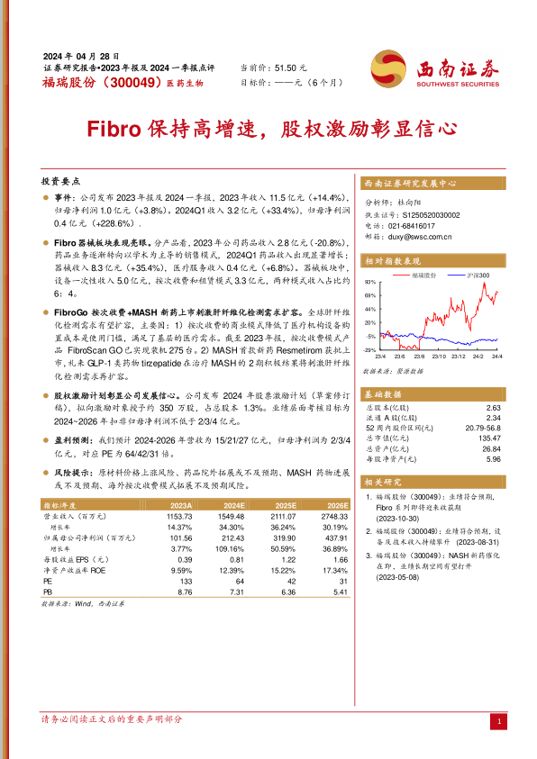 本报告对福瑞股份的2023年业绩和2024年一季度业绩进行了分析,认为公司在Fibro系列产品的驱动下,业绩保持高速增长。按次收费模式的推广和MASH新药的上市,将进一步扩大肝纤维化检测市场需求。股权激励计划的推出,也彰显了公司对未来发展的信心。然而,投资者也应关注报告中提示的各项风险,审慎决策。