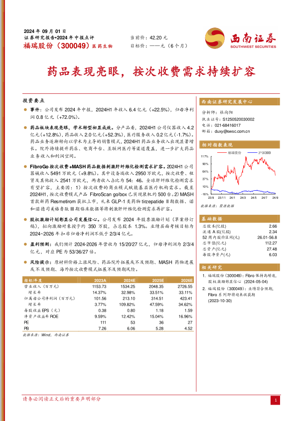 福瑞股份2024年中报显示公司业绩增长强劲,药品业务转型和FibroGo按次收费模式是主要驱动力。MASH药物的进展有望进一步扩大肝纤维化检测市场。公司股权激励计划彰显了对未来发展的信心。报告同时提示了原材料价格上涨、药品院外拓展、MASH药物进展以及海外按次收费模式拓展等风险。