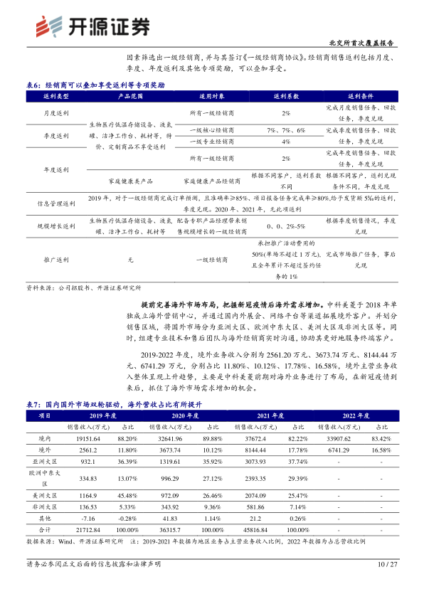 专注于生物医疗低温存储领域,2022年实现营收4.06亿元中科美菱专注于生物医疗低温存储领域,核心围绕低温存储设备(45%)、超低温冷冻存储设备(41%)、智慧冷链项目(2%)以及家庭健康产品(6%),具体产品包括医用冷藏冷冻箱、极低温冷冻储存箱、液氮存储罐等。经销商贡献87%的销售收入,海外营收增长至17%左右。2022年实现营收4.06亿元(-12.64%)、归母净利润5258.69万元(-22.09%)。我们预计公司2023-2025年的归母净利润分别为0.53/0.59/0.67亿元,对应EPS分别为0.55/0.61/0.69元/股,对应当前股价的PE分别为18.1/16.2/14.3倍,公司多项产品技术达行业领先水平,并积极布局海外市场,首次覆盖给予“增持”评级。