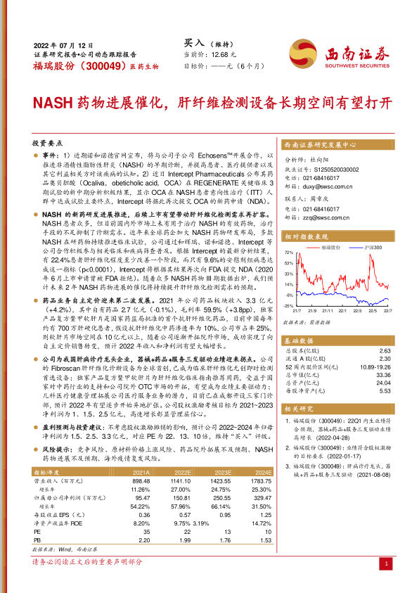 本报告分析了福瑞股份在 NASH 药物研发进展催化下,肝纤维化检测设备长期空间有望打开的投资机会。报告指出,NASH 药物的研发进展将带动肝纤维化检测需求的增长,公司的药品业务受益于自主定价和院外市场的开拓,有望实现收入和净利润的大幅增长。同时,公司的器械、药品和服务三项业务共同驱动业绩增长,管理层对公司未来发展充满信心。维持“买入”评级。