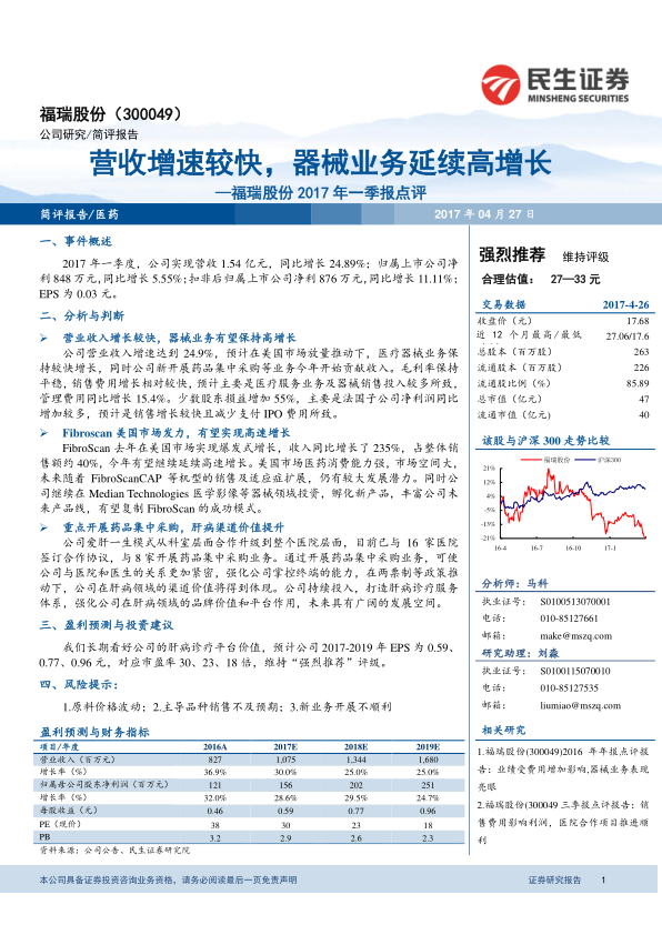 福瑞股份2017年一季报点评:营收增速较快,器械业务延续高增长