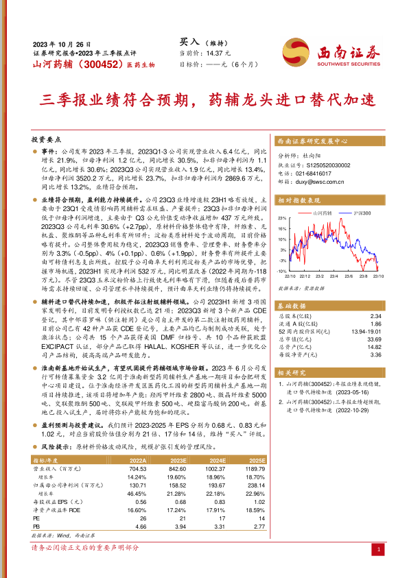 本报告对山河药辅(300452)2023年三季报进行了深度分析,核心观点如下: