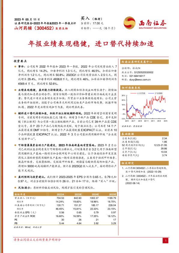 本报告分析了山河药辅(300452)2022年年报和2023年一季报,并维持“买入”评级。