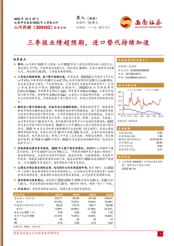 本报告分析了山河药辅(300452)2022年三季报,指出公司业绩超预期,主要受益于进口替代加速。报告还分析了公司在辅料进口替代、注射辅料领域的积极拓展、淮南新基地建设以及成为联合国采购供应商等方面的进展,并维持“买入”评级。
