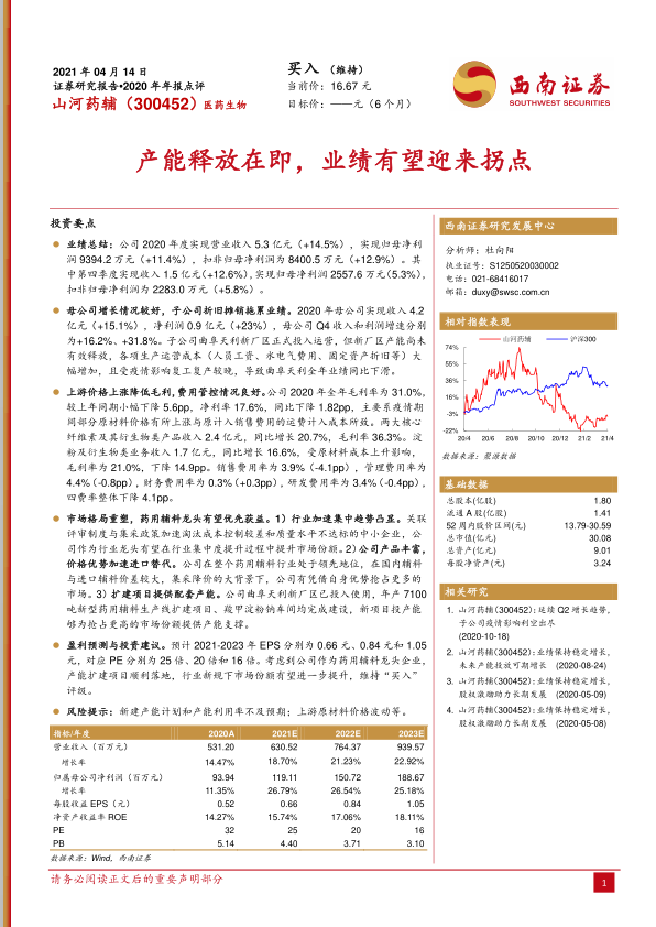 本报告对山河药辅(300452)2020年年报进行了深度分析,核心观点如下: