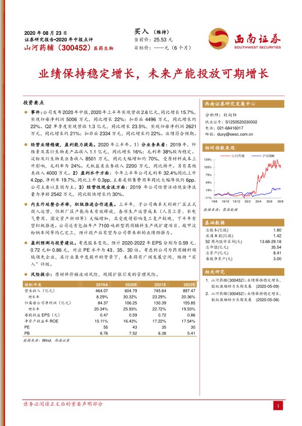 山河药辅在2020年上半年实现了营收和归母净利润的双位数增长,显示出稳健的经营态势。公司通过优化销售费用结构,有效提升了盈利能力。同时,多个新产能项目正在积极推进中,预计未来将为公司业绩增长提供强劲动力。