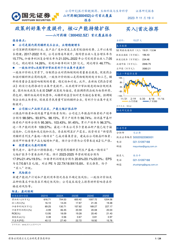替代进口、海外出口持续推进;“新型药用辅料系列生产基地一期项目”大幅扩张多个重要品种产能。预计 2023-2025 年营收增速分别为17.9%/21.4%/19.5%;归母净利润增速分别为 20.6%/20.1%/20.0%; EPS为 0.7/0.8/1.0 元/股,对应 PE 为 22.7X/18.9X/15.8X。 首次推荐, 给予“买入”评级。