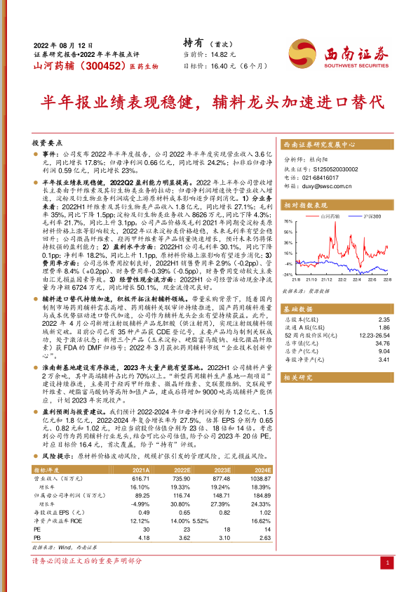 本报告对山河药辅(300452)2022年半年报进行了深入分析,并首次覆盖给予“持有”评级,目标价16.4元。