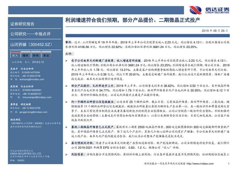 本报告对山河药辅2019年半年报进行了分析,指出公司利润增速符合预期,主要受益于产品提价和成本控制。公司在辅料品种登记激活、客户结构优化和产能扩张方面取得积极进展,维持“买入”评级。同时,报告也提示了并购整合、原材料价格和行业集中度等风险因素。
