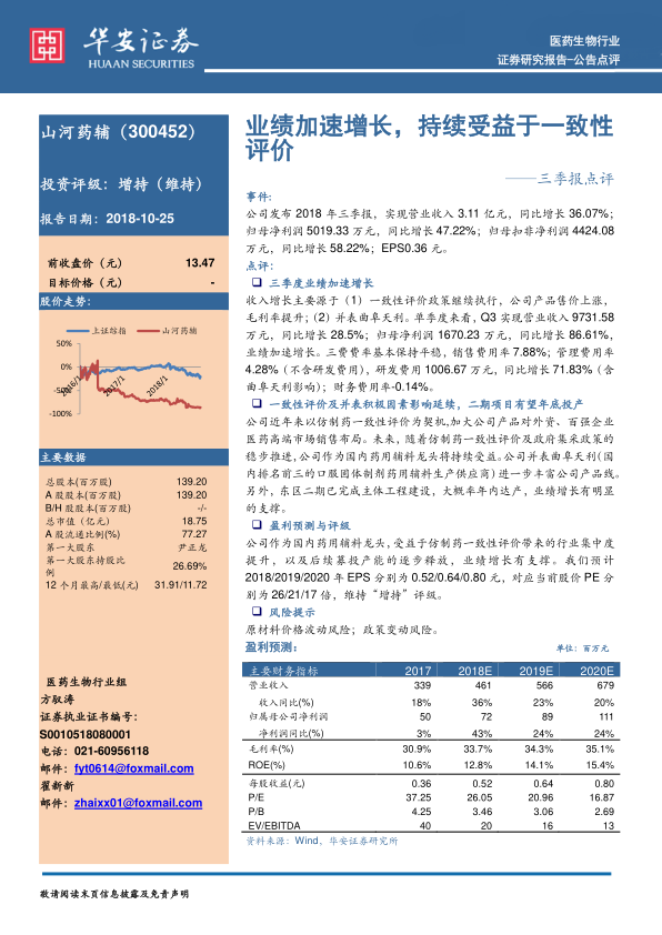 本报告对山河药辅2018年三季报进行了点评,认为公司业绩加速增长主要受益于一致性评价政策和并表曲阜天利。公司作为国内药用辅料龙头,将持续受益于行业集中度提升和产能释放。维持“增持”评级,但需关注原材料价格波动和政策变动风险。