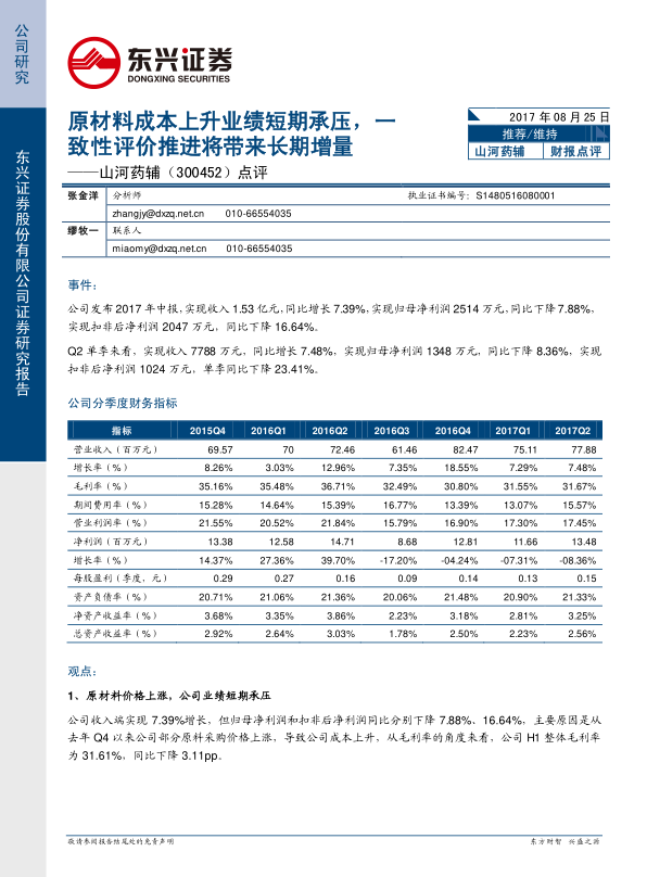 报告指出,山河药辅2017年中报显示,虽然收入有所增长,但归母净利润和扣非后净利润同比下降,主要原因是原材料价格上涨导致成本上升,毛利率下降。
