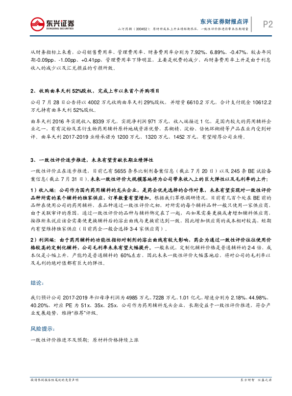 我们预计公司2017-2019 年归母净利润为4985 万元、7228 万元、1.01 亿元,增速分别为2.18%、44.98%、40.20%,对应 PE 为 51x、35x、25x,公司作为药用辅料龙头企业,长期受益于一致性评价推进,符合产业发展趋势,维持“推荐”评级。