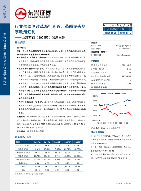 山河药辅(300452)作为国内口服固体制剂药用辅料领域的领先企业,凭借其清晰的股权结构、持续的自主研发投入、中高端产品定位以及“自建+外延”的资本扩张策略,将显著受益于此次行业供给侧改革。公司在微晶纤维素、交联羧甲纤维素钠、硬脂酸镁、羧甲淀粉钠等核心产品上已占据国内领先地位。随着募投项目在2018年5月全面完成,以及对曲阜天利52%股权的成功收购,公司产能将大幅提升,并有望打造一站式药辅平台。一致性评价和共同审评政策将促使药企选择优质辅料,推动山河药辅实现业务的“量价齐升”,并因共同审评带来的制剂与辅料绑定效应,为其通过一致性评价的品种创造2-3年的“独占期”。报告预计公司2017-2019年归母净利润将分别达到0.48亿元、0.69亿元和1.12亿元,并上调评级至“强烈推荐”,目标价37.5元,预示着公司将迎来业绩爆发期。