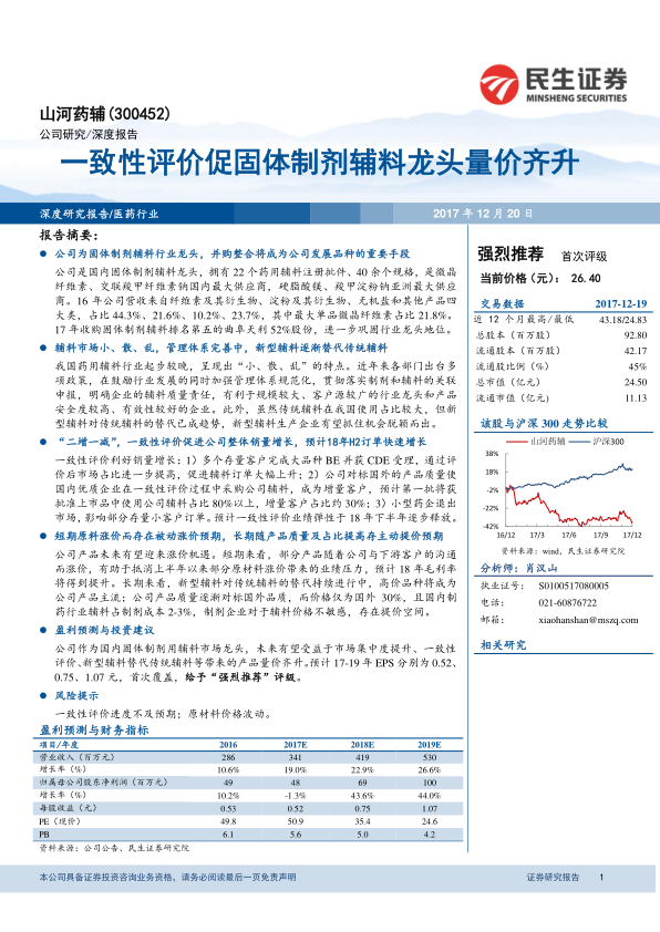 基于上述分析,公司作为国内固体制剂用辅料市场龙头,未来有望受益于市场集中度提升、一致性评价、新型辅料替代传统辅料等带来的产品量价齐升。预计2017-2019年公司归母净利润分别为0.48亿、0.69亿、1亿,每股收益(EPS)分别为0.52、0.75、1.07元。鉴于其市场地位和增长潜力,首次覆盖给予“强烈推荐”评级。