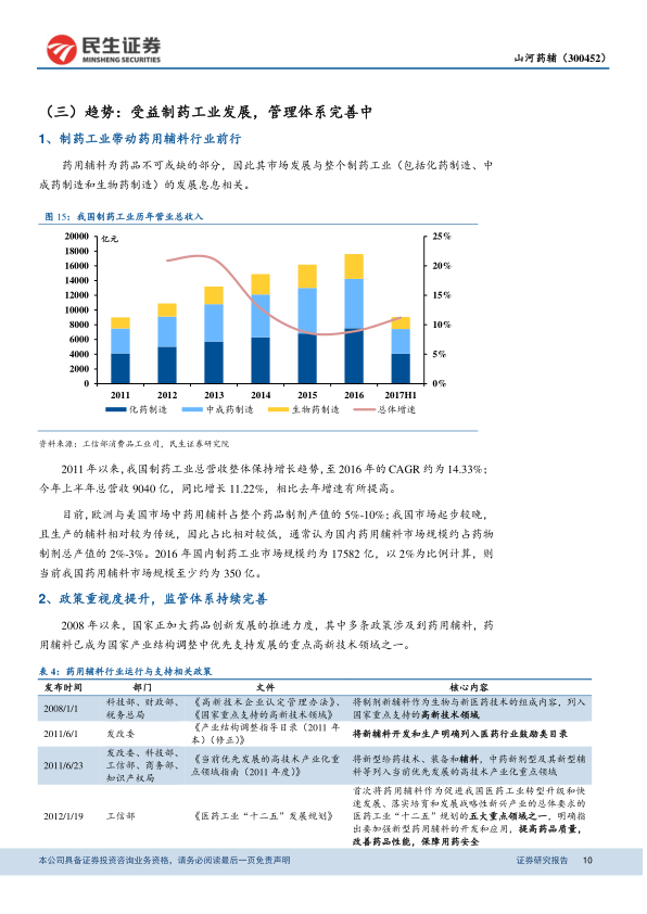 然而,随着制药工业的快速发展和政策重视度的提升,药用辅料行业正迎来结构性变革。我国制药工业总营收在2011-2016年间保持14.33%的复合年增长率,2016年市场规模达17582亿元。按照国内药用辅料占制剂总产值2%-3%的比例估算,当前市场规模至少约为350亿元。