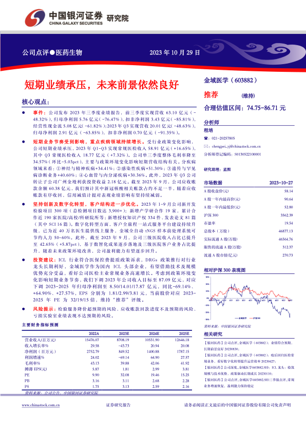 金域医学短期业绩受到政策影响承压,但常规医检业务和重点疾病领域保持增长。公司通过创新、数字化转型和优化客户结构,提升长期竞争力。作为ICL行业龙头,金域医学有望受益于医保控费和DRGs政策。维持“推荐”评级,但需关注检验服务降价、应收账款回款和亏损实验室业绩等风险。