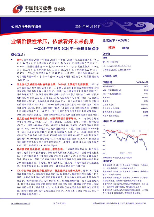 金域医学在2023年及2024年第一季度面临业绩阶段性承压,主要受公共卫生事件相关检验需求消退、行业环境变化及大额信用减值计提等因素影响,导致营收和利润显著下滑。然而,公司常规医检业务保持稳健增长,并在神经与精神疾病、感染性疾病等领域表现突出。通过持续的新项目开发和创新高端项目的培育,公司增强了综合服务竞争力,并提升了三级医院收入占比。金域医学积极推进数智化转型,旨在通过大数据和人工智能技术提升运营效率、降低成本,并已在宫颈癌筛查、tNGS样本处理等方面取得成效,预计将驱动盈利能力持续改善。报告强调,ICL行业符合医保控费提质增效的长期趋势,尽管短期竞争激烈,但作为行业龙头的金域医学凭借其集约化检测、高检验质量和丰富检验项目的优势,有望在行业整合中充分受益,长期发展前景依然良好。基于此,尽管下调了短期财务预测,但仍维持“推荐”评级,并提示了检验服务降价、应收账款回款、亏损实验室业绩及院端诊疗量恢复不及预期等风险。