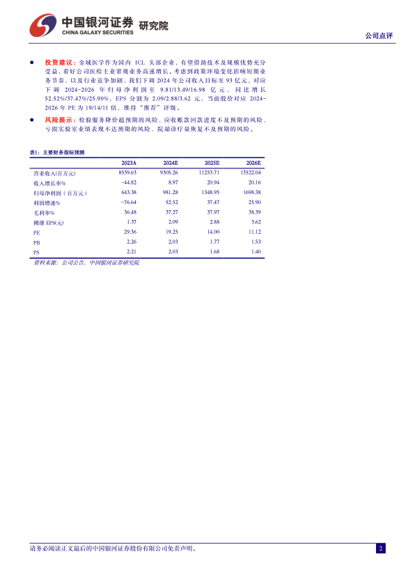 鉴于政策环境变化影响短期业务节奏以及行业竞争加剧,中国银河证券研究院下调了金域医学的财务预测。将2024年公司收入目标调整至93亿元,并下调2024-2026年归母净利润至9.81亿元、13.49亿元和16.98亿元,同比分别增长52.52%、37.47%和25.90%。对应的摊薄EPS分别为2.09元、2.88元和3.62元。当前股价对应2024-2026年PE分别为19倍、14倍和11倍。基于公司作为国内ICL头部企业的技术及规模优势,以及医检主业常规业务的高速增长潜力,维持“推荐”评级。