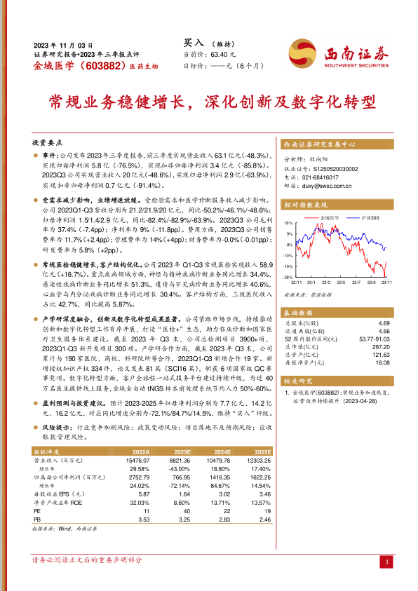本报告分析了金域医学2023年三季报,指出公司业绩受外部环境影响有所下滑,但常规医检业务保持稳健增长,客户结构持续优化。公司在创新和数字化转型方面积极投入并取得显著成果,为未来发展奠定基础。尽管面临行业竞争和政策变动等风险,但考虑到公司在细分领域的优势和未来增长潜力,维持对金域医学的“买入”评级。