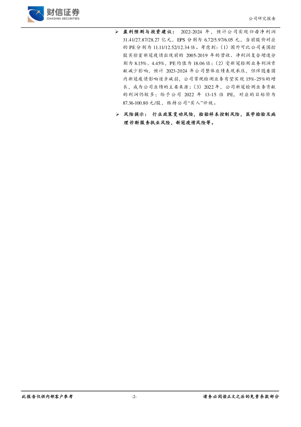 风险提示:行业政策变动风险,检验样本控制风险,医学检验及病理诊断服务执业风险,新冠疫情风险等。