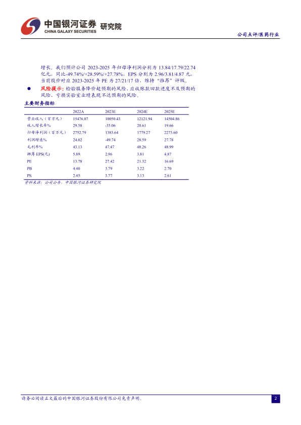 风险提示:检验服务降价超预期的风险、应收账款回款进度不及预期的风险、亏损实验室业绩表现不达预期的风险。