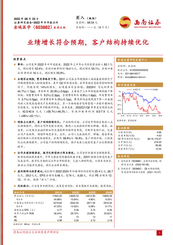 金域医学2022年上半年业绩表现亮眼,营业收入和归母净利润均实现高速增长,超出市场预期。公司通过优化产品结构,提升特检业务占比,并深化与三级医院的合作,持续优化客户结构。同时,数字化转型和合作共建模式的推进,有效提升了运营效率并降低了费用率,确保了在毛利率承压下的净利率增长。展望未来,公司在八大疾病线诊断领域的研发投入和市场拓展,以及数字化战略的深化,将为其持续增长提供动力。尽管面临行业竞争、政策变动和疫情等风险,但公司凭借其核心竞争力,预计将保持稳健发展,维持“买入”评级。