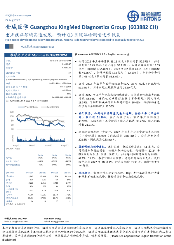 本报告分析了金域医学2022年上半年的业绩表现,重点关注了其在重点疾病领域的高速发展和运营效率的提升。报告认为,金域医学作为国内ICL龙头,正迎来高质量发展加速期。同时,报告也提示了新冠疫情、行业政策和市场竞争等风险因素。基于对公司基本面的分析和未来盈利的预测,维持“优于大市”评级,并给出了相应的目标价。